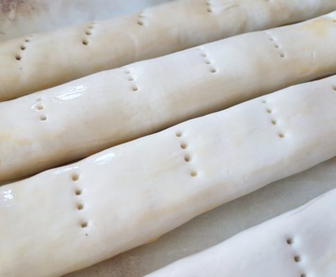 - Cut a sheet of puff pastry into two (one sheet can make two long sausage rolls)