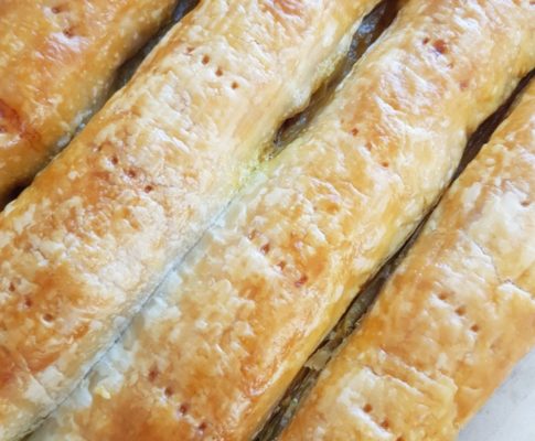 - Lay mixture on one side of your pastry and roll over, fold in the ends