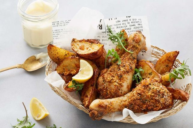 Try this Cornflake-Crumbed Chicken with Wedges! It’s a fun one! Season with breadcrumbs, cornflakes, smoked paprika and parsley. Shake it. Bake it. Then eat it!