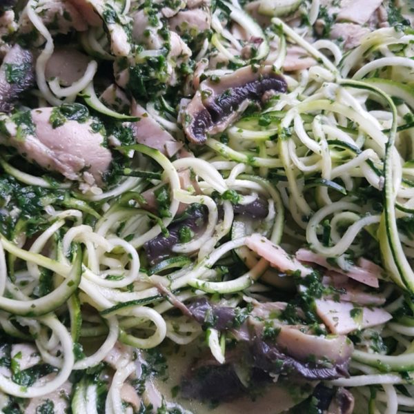 4. Once your chicken, mushrooms, bacon and onion are cooked, drain the pan of any oil and add your zucchini noodles and stir through the cream.