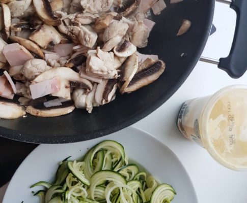 4. Once your chicken, mushrooms, bacon and onion are cooked, drain the pan of any oil and add your zucchini noodles and stir through the cream.