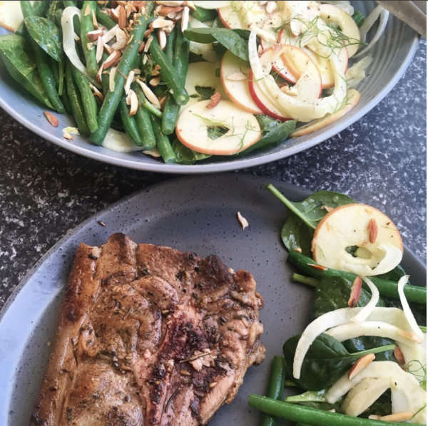 - Garnish with the toasted almonds and reserved fennel fronds and serve with the pork chops.