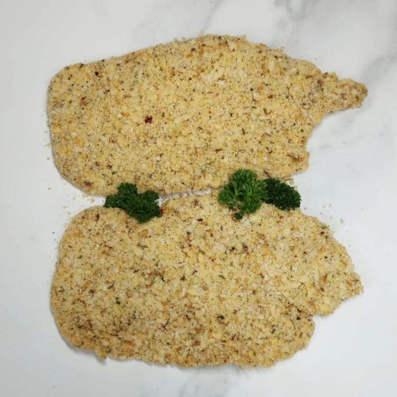 Pork Steaks Crumbed in our Herb & Garlic Sprinkle. This product does not contain egg. Steroid, Hormone, Antibiotic and Additive Free.