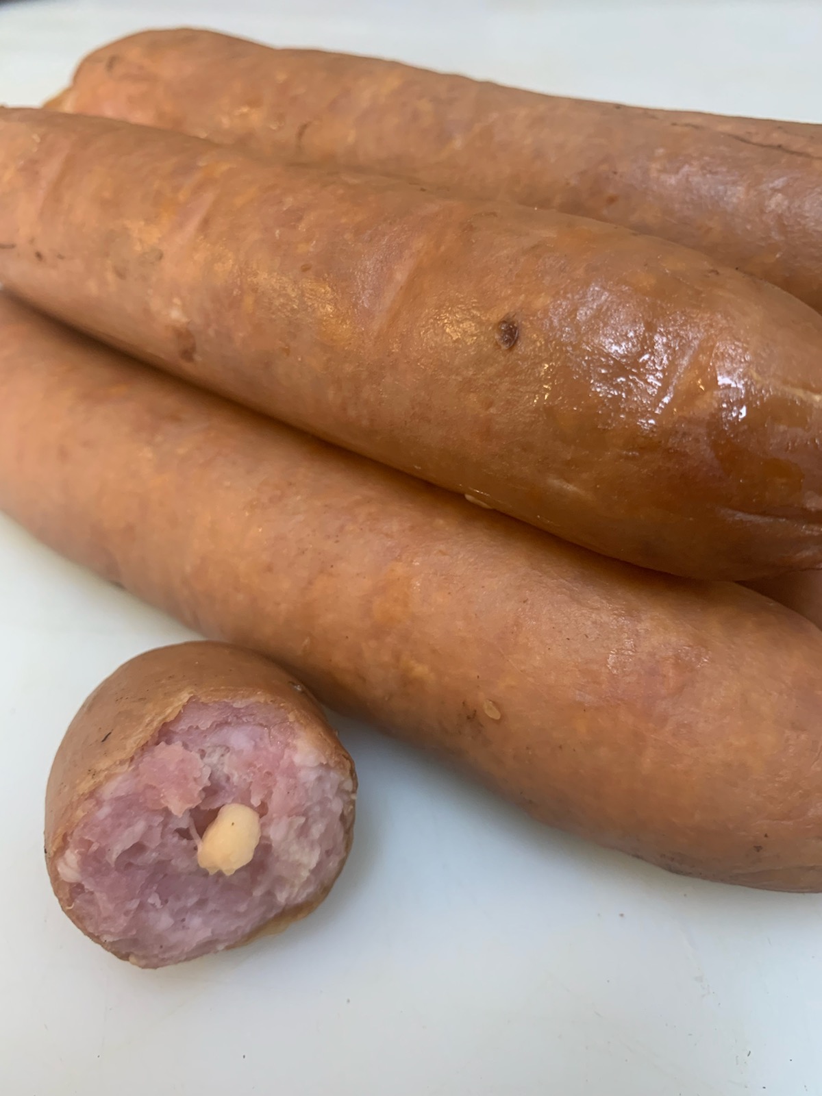 A smokey german style pork sausage oozing with cheese.